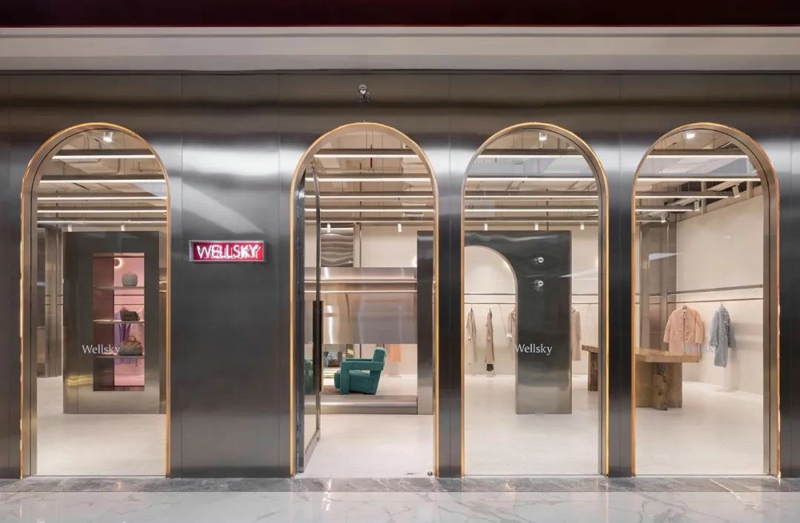 (4)門頭外觀設(shè)計(jì)。門頭的外觀在設(shè)計(jì)上要與周圍環(huán)境以及品牌調(diào)性和品類相協(xié)調(diào)。門頭外觀展現(xiàn)服裝店的檔次和個(gè)性,常用的有兩種風(fēng)格分別是現(xiàn)代風(fēng)和傳統(tǒng)風(fēng),通常商場(chǎng)里的服裝店門頭都是以現(xiàn)代風(fēng)為主。在設(shè)計(jì)上要與周邊的環(huán)境互相協(xié)調(diào)融合,門頭外觀的整體風(fēng)格要依據(jù)甲方品牌的調(diào)性和品類來決定,如果是比較有地域特色的服飾可以采用傳統(tǒng)風(fēng)格。